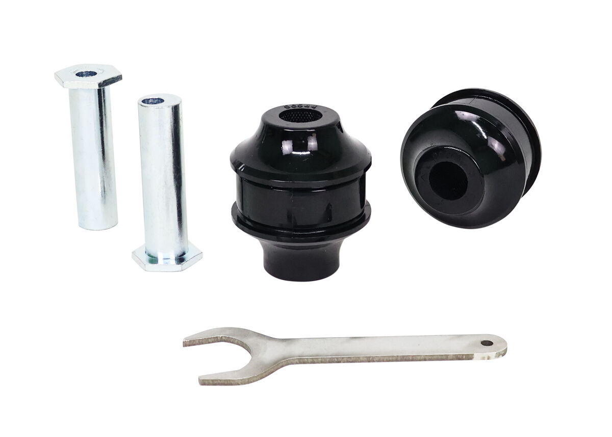 Whiteline-Nachlaufsätze sind darauf ausgelegt, die Kurvenhaftung und die Geradeausstabilität des Fahrzeugs zu verbessern. Dieser Satz wird mit doppelt versetzten Buchsen geliefert, um ein besseres Lenkgefühl, mehr Lenkgewicht und höhere Präzision durch erhöhten statischen Nachlauf und dynamische negative Sturzverstärkung zu bieten. Darüber hinaus sorgen Whiteline-Buchsen für eine verbesserte Bremsleistung und weniger Spurveränderungen unter Last.