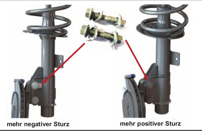 Die Whiteline Sturzeinstellungsschrauben ersetzen die originalen oberen Schrauben, die den Radträger am Federbein befestigen. Über einen Exzenter erlauben diese nun den Sturz um einen festen Wert negativer oder positiver zu machen, um entweder den Sturz „gen positiv“ zu korrigieren oder „mehr“ negativen Sturz zu generieren, um das Fahrverhalten zu verbessern. Gerade bei großen Tieferlegungen geschieht es immer wieder, dass der Sturz zu negativ ist und somit einseitig abgefahrene Reifen daraus resultieren. Mit den Sturzeinstellungsschrauben kann der Sturz folglich wieder „positiver“ gemacht werden.